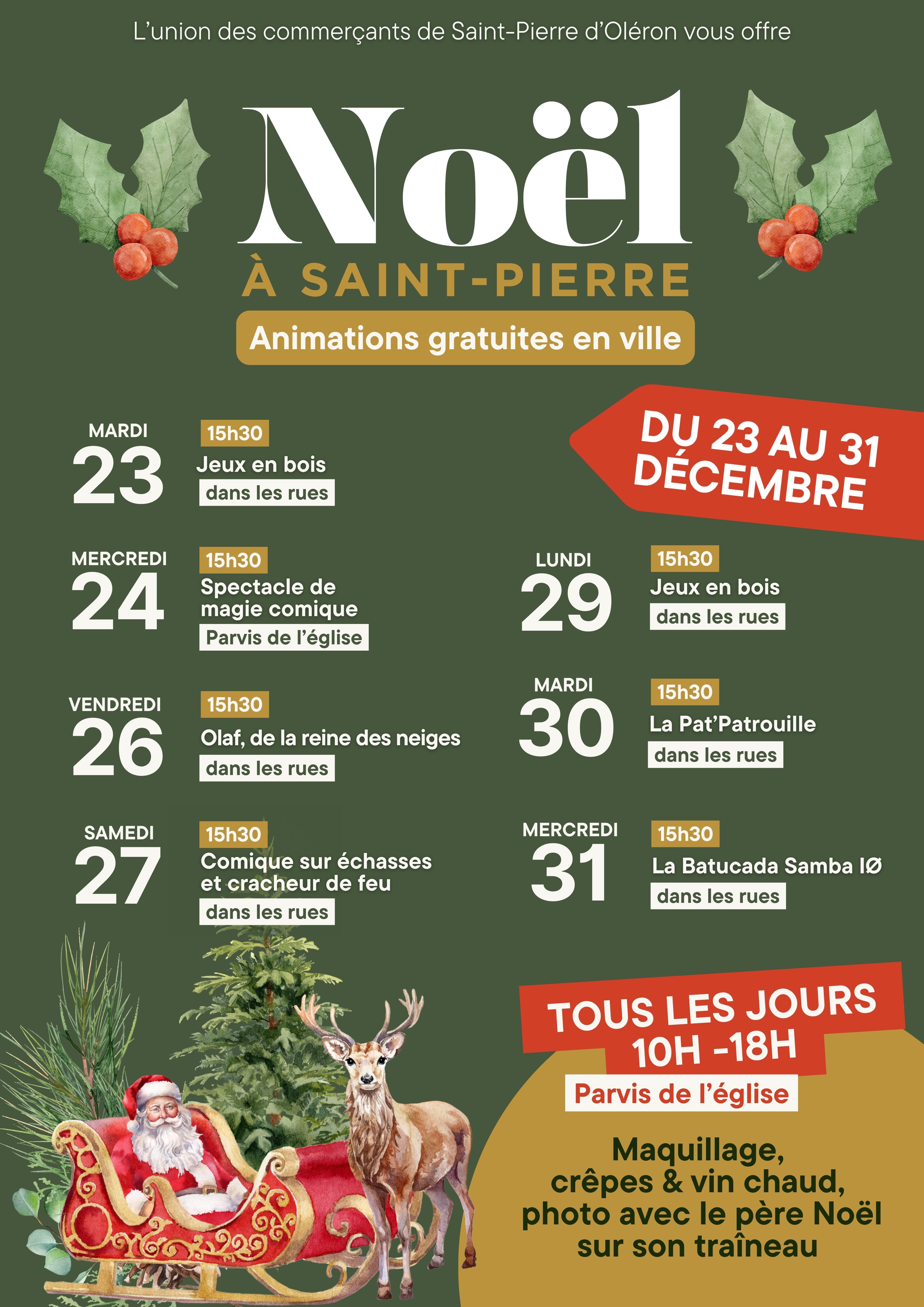 Du 23 au 31 décembre 2025, l'union des commerçants et artisans de Saint-Pierre d'Oléron propose de nombreuses animations gratuites dans les rues du centre-ville.