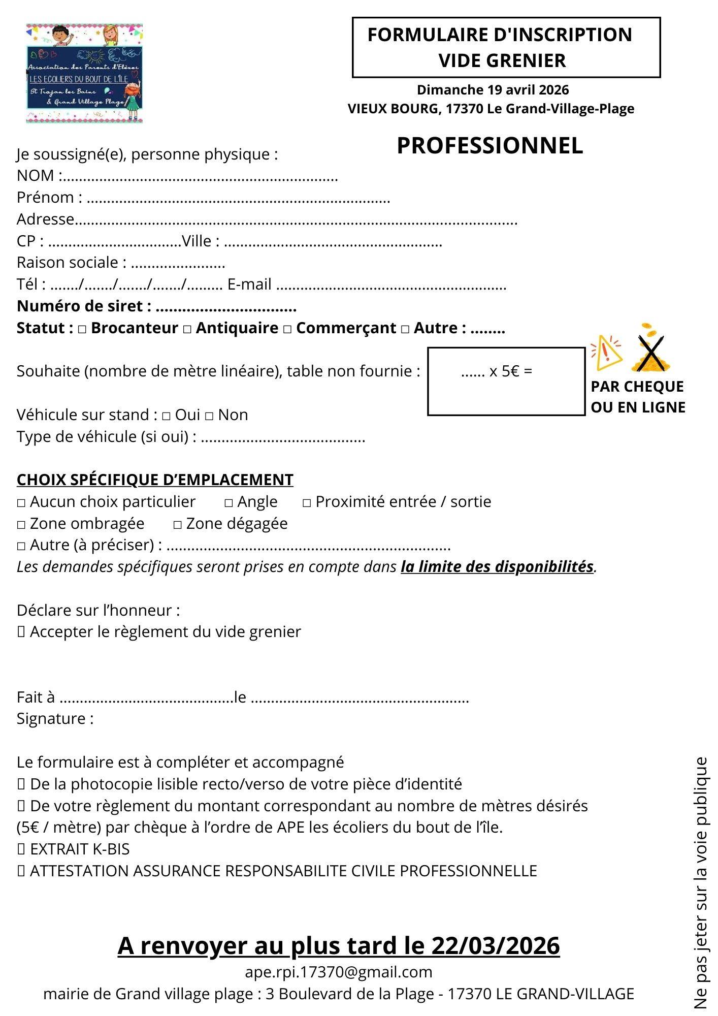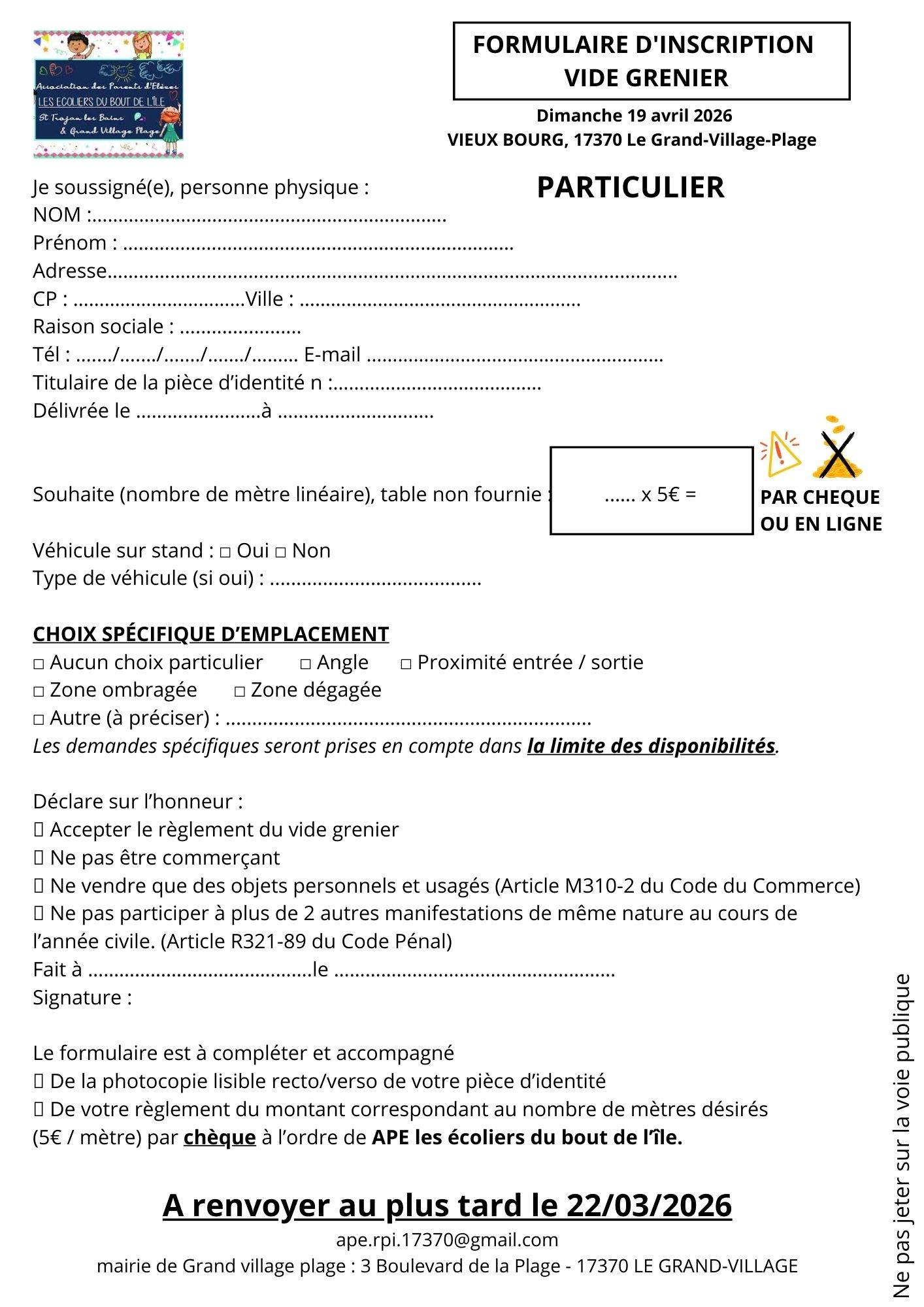 Réservations par mail : ape.pri.17370@gmail.com ou à la Mairie de Le Grand-Village Plage